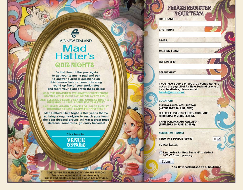 Design for an entertainment night registration form for staff at Air New Zealand. Created for Satellite Media.